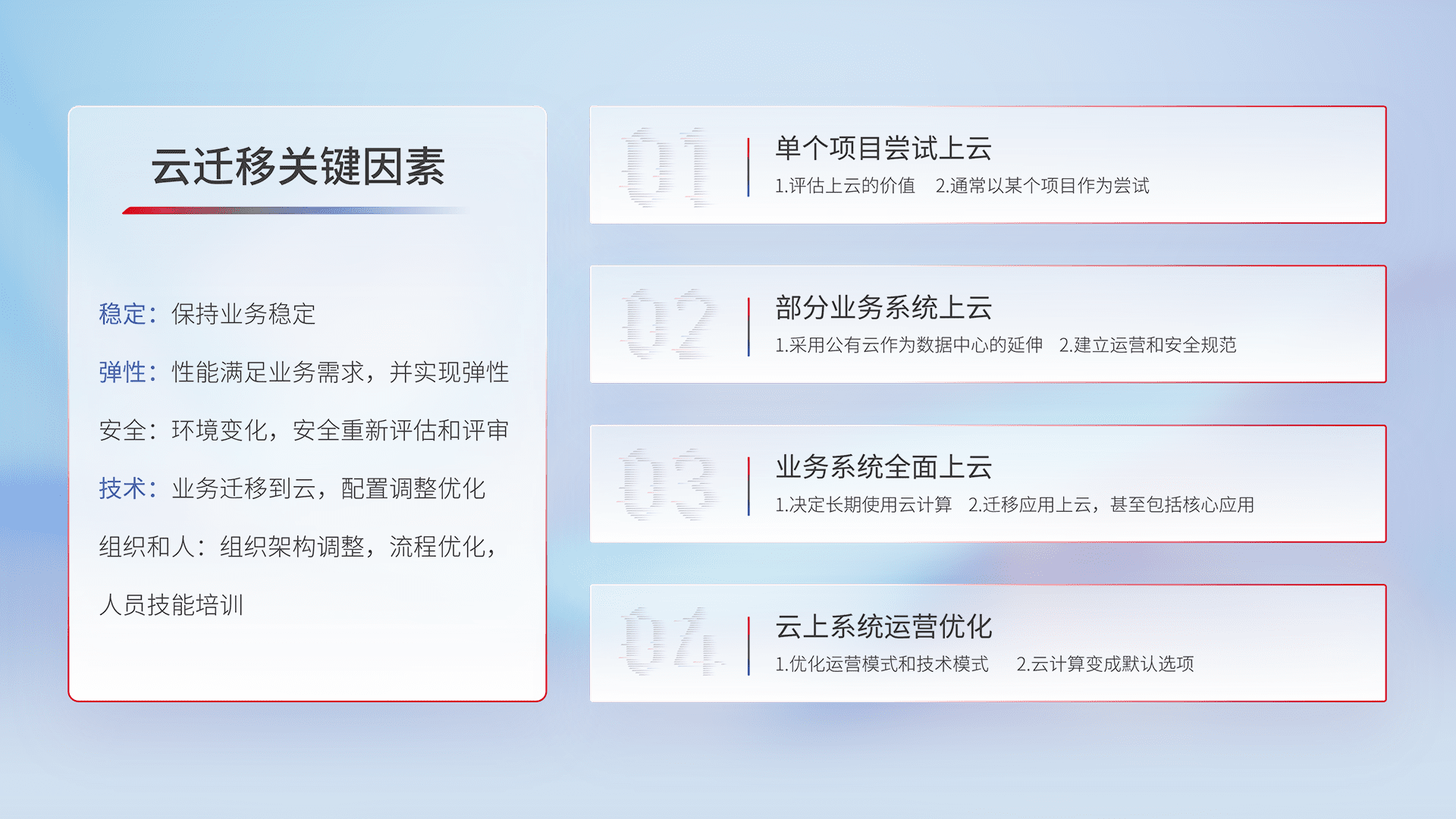 结合实际业务,,,从规划设计、、、、云平台选型、、、云原生改造、、数据迁移、、集成交付,,迁移全过程为客户识别最佳上云路径,,,,做好风险识别管理,,,设计网络架构、、、、身份权限、、、安全审计合规、、操作审计、、、、日志审计、、、监控告警策略、、、、多站点容灾设计等,,,,对云上基础设施进行整体规划,,,提升IT治理水平,,,,以满足弹性、、高可用、、高性能的需求。。