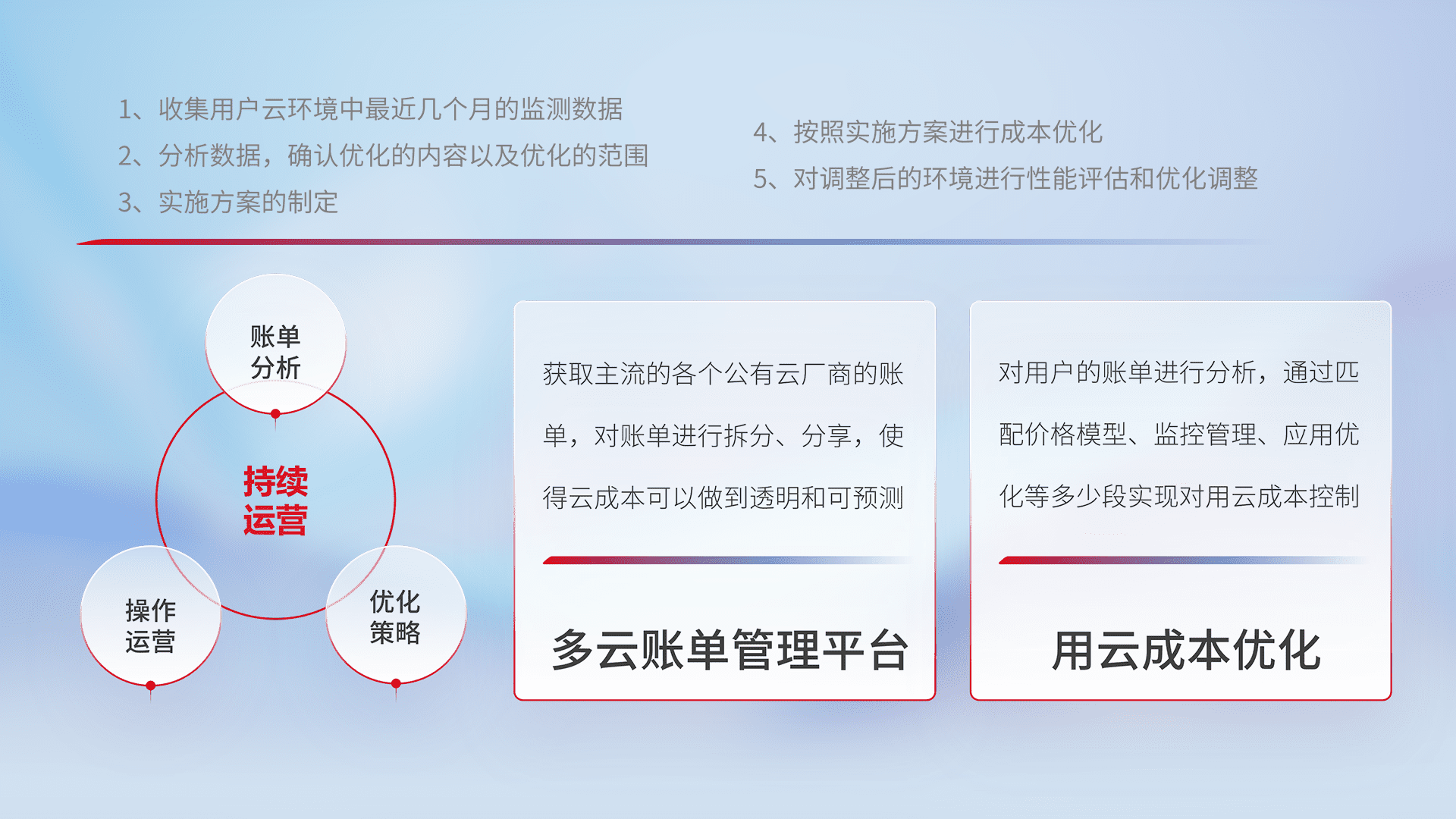 通过多云纳管,,以统一的资源数据模型把客户的云资源进行抽象和封装,,,进而实现对多云资源的统一操作,,,保障云资源管理的可靠性、、稳定性与可用性。。量身定制化运维内容,,,配置、、、、开发运维、、补丁管理、、备份、、监控、、认证和访问管理、、、审计和日常巡检等,,保障在用云过程中的可靠度,,稳定度以及高可用率。。