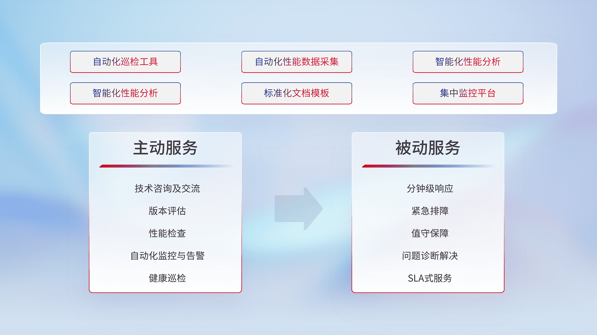 智能化工具和标准化文档,,,保障服务质量,,,,提供主动服务(包含技术咨询、、、、版本评估、、性能检查、、、自动化监控与告警、、、、健康巡检)和被动服务包含(分钟级响应、、、紧急排障、、、、值守保障、、问题诊断解决、、、、SLA服务)。。