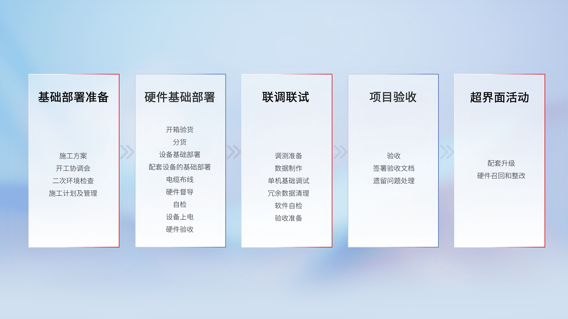 从基础部署准备、、、硬件基础部署、、、、联调联试、、、项目验收、、、、越界面活动的全过程可追溯,,保证施工质量和进度。。