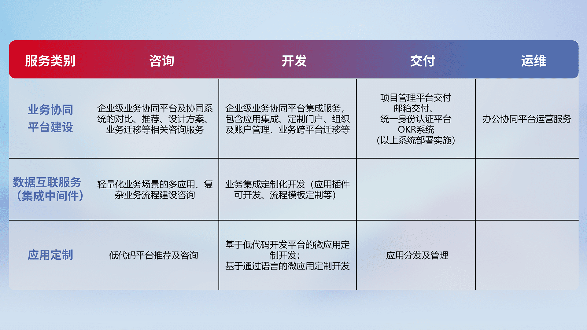 针对钉钉、、、、企微、、IDaas等平台级产品提供产品的规划、、方案、、交付、、、定制化开发等服务,,实现如统一协同办公、、、、智能客户服务、、混合会议管理、、、、智能数据查询、、、等业务场景,,,实现数字化转型。。